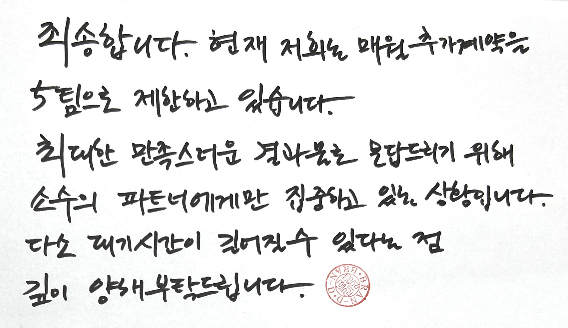저희는 매월 추가계약을 5팀으로 제한하고 있습니다